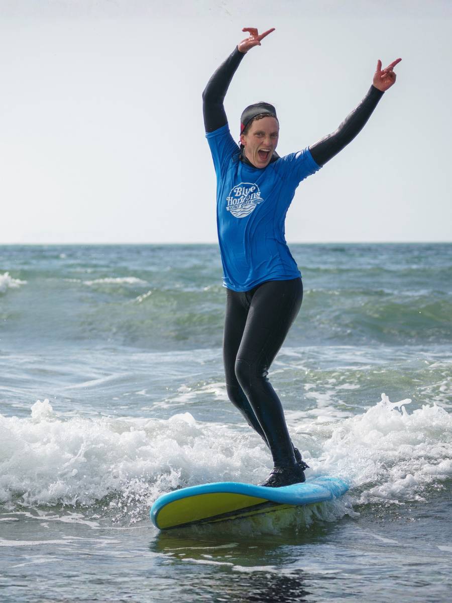 At 50+ Ive just completed a fabulous beginners' group surfing course with the Blue Horizons team. They have managed to get me from beginner to standing up and starting to move around the board in 6 sessions! I am completely amazed (and addicted!.) The bespoke instruction from knowledgeable, approachable and cheerful staff who were in the water with us throughout- and keen to help us improve - deserves the credit for this! I can't wait to get back in the water with them again (and hope to enthuse my children to join me!)